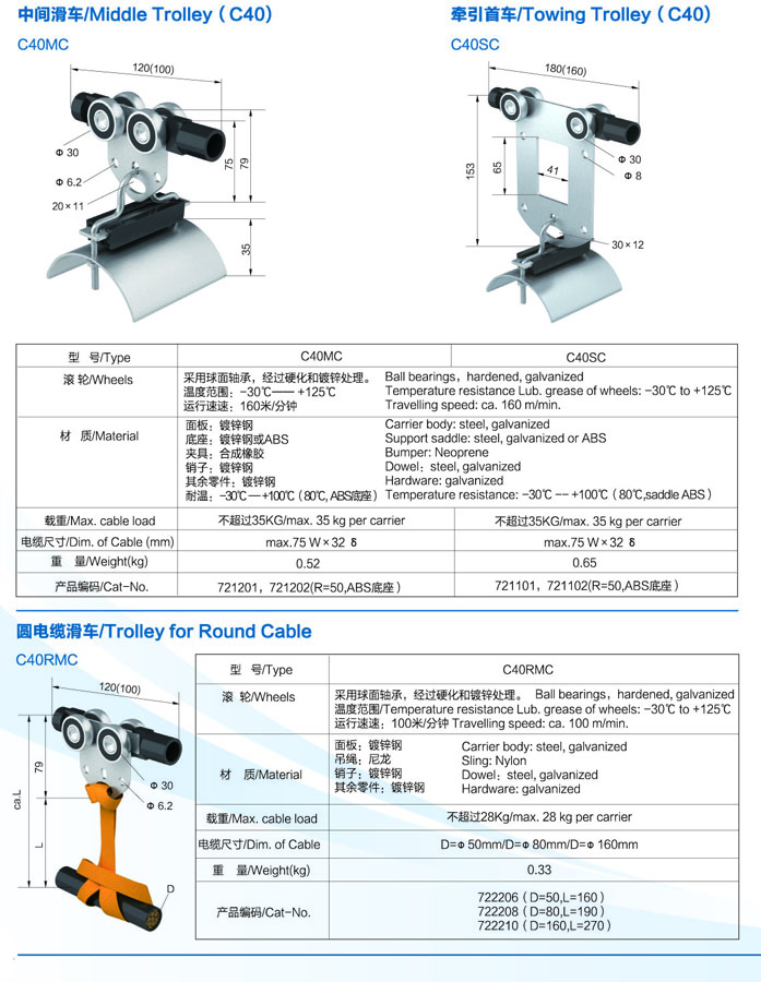 商品簡介:電纜滑車是一種理想的物流供電系統(tǒng),適用于室內(nèi)外、多灰、多塵、溫差較大、環(huán)境要求較低、運(yùn)行平穩(wěn)。安能滑車的電纜滑車軸承為球面接觸,使小車的移動靈活、穩(wěn)固、均勻、故障率極低。扁電纜及圓電纜均能安裝使用,并在滑車上裝有緩沖裝置及電纜保護(hù)裝置。目前,電纜滑車廣泛應(yīng)用于各種通用橋、門式起重機(jī)、電動葫蘆自行小車、倉庫、創(chuàng)長、碼頭等起重設(shè)備的移動供電。