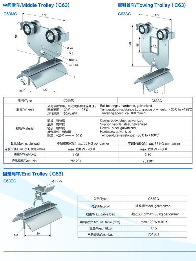 商品簡介:電纜滑車是一種理想的物流供電系統(tǒng),適用于室內(nèi)外、多灰、多塵、溫差較大、環(huán)境要求較低、運(yùn)行平穩(wěn)。安能滑車的電纜滑車軸承為球面接觸,使小車的移動靈活、穩(wěn)固、均勻、故障率極低。扁電纜及圓電纜均能安裝使用,并在滑車上裝有緩沖裝置及電纜保護(hù)裝置。目前,電纜滑車廣泛應(yīng)用于各種通用橋、門式起重機(jī)、電動葫蘆自行小車、倉庫、創(chuàng)長、碼頭等起重設(shè)備的移動供電。