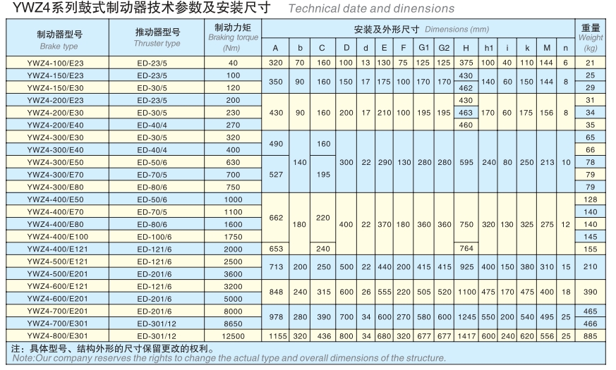 YWZ4系列制動(dòng)器連接尺寸和制動(dòng)力矩參數(shù)符合JB/ZQ4388-86和GB6333-86(帶A系列)標(biāo)準(zhǔn),技術(shù)要求符合JB/T6406-2006標(biāo)準(zhǔn)。