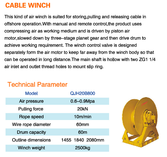 this kind of air winch is suited for storing, puling and releasing cable in offshore operation.