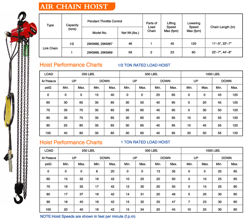 Description:KOMAY air hoists are all precision built chain type hoists which are designed with three rated loads,1/4, 1/2 and 1 ton. Each model features a pendant throttle control, a swivel top mount hook and a swivel load chain hook with safety latch.