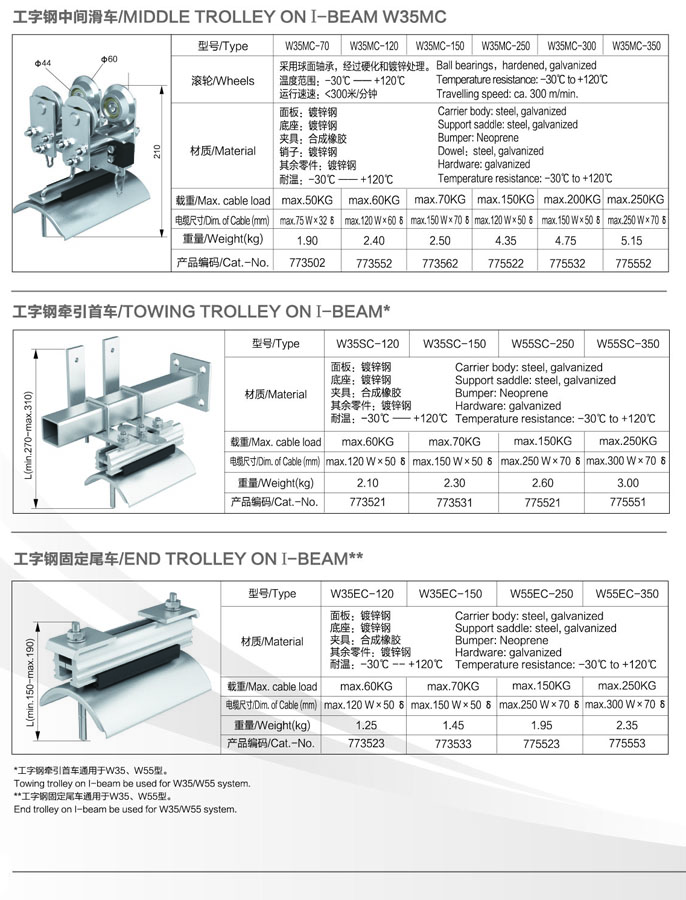 Description:This series of I-Beam trolleys and components integrating our worldwide job proven flat cable provides a safe, efficient and maintenance free method of mobile electrification.